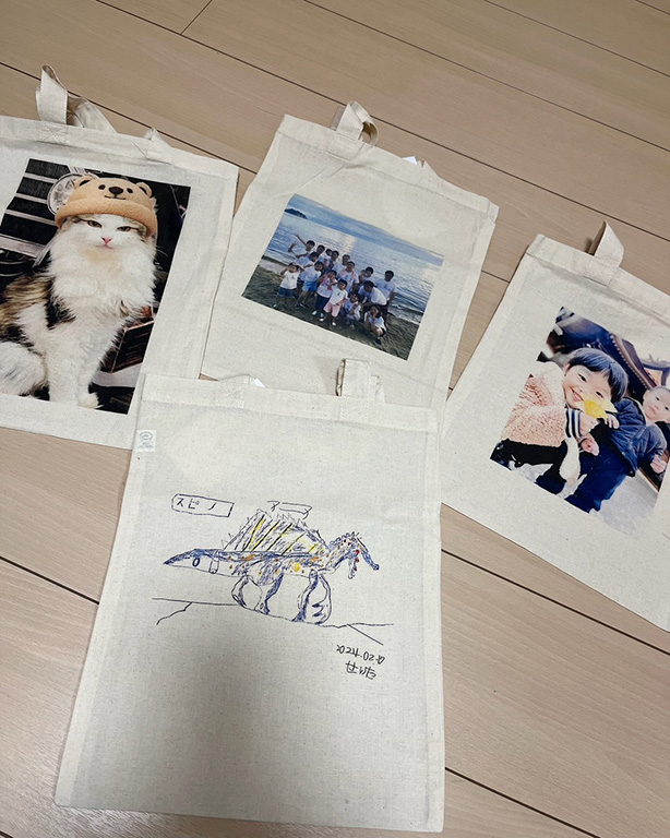 英会話を経営しています。 イベント時に、子供たちが書いた絵をハンカチやトートーバックにプリントしてもらいました。それぞれのイラストや写真を印刷してお渡ししたら、子供たちや保護者の方にも大変喜んで頂きました!